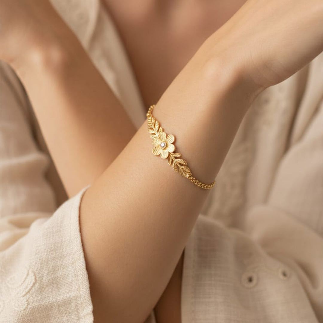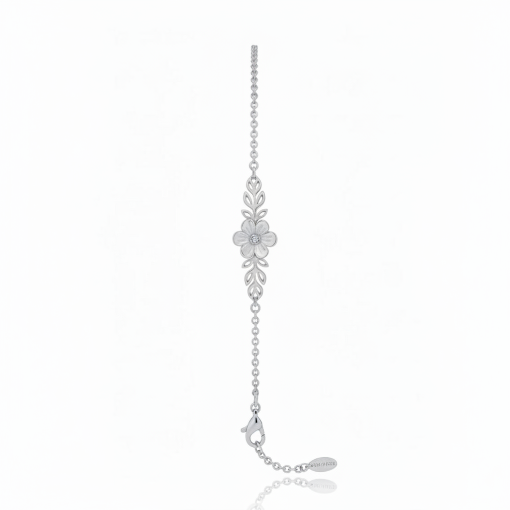Elegance meets nature in this delicate silver bracelet featuring a beautifully crafted flower charm at its center. The blooming floral design is accented with a sparkling crystal in the middle, flanked by intricately detailed leaf motifs on either side. Made with a fine chain and secure lobster clasp closure, this bracelet offers both style and comfort. Perfect for everyday wear or gifting on special occasions. Adjustable length for a custom fit.