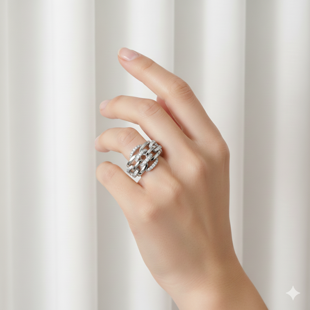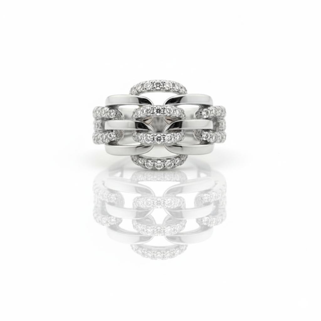 Make a bold statement with this luxurious silver interlocked chain link ring. Three overlapping oval links form a dynamic, modern design, with two rows of sparkling cubic zirconia crystals pave-set across the links for maximum brilliance. The chunky yet elegant structure offers a contemporary edge, perfect for stacking or wearing as a standalone piece. Ideal for those who love edgy sophistication.