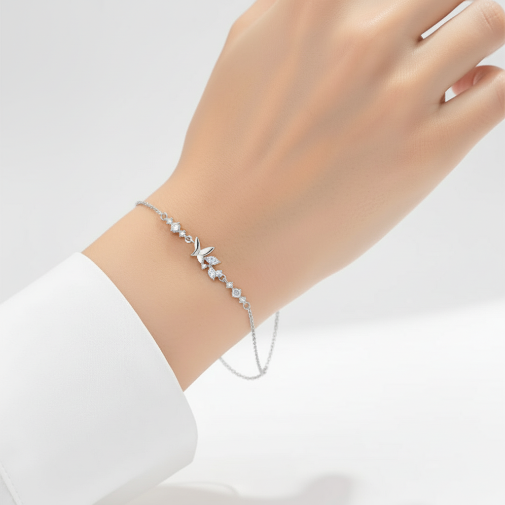 Let your wrist bloom with natural beauty — the Silver Leaf Crystal Bracelet by Strela-Co adds the perfect touch of sparkle to your look.