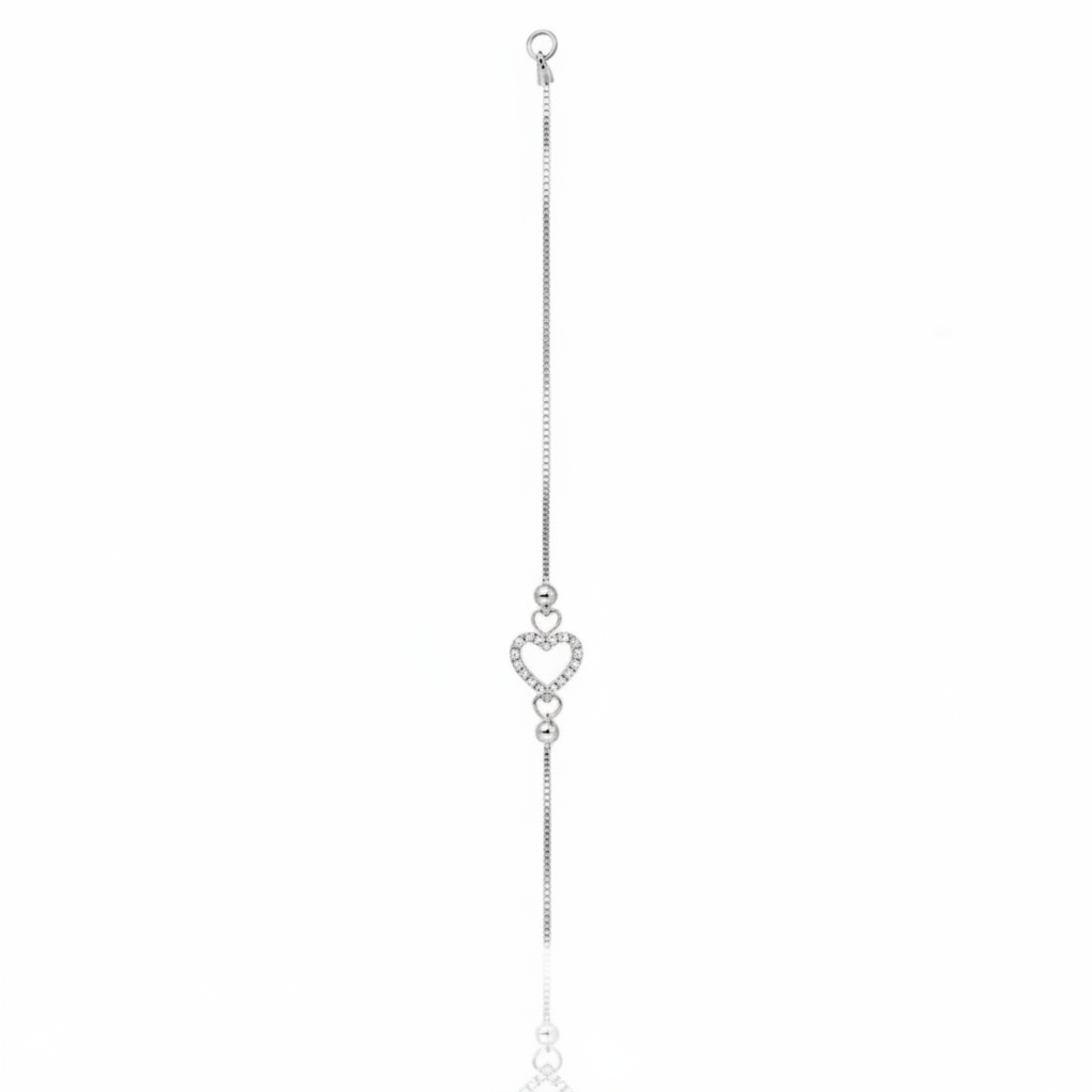 Add a touch of sophistication and romance to your look with our Elegant Heart Charm Silver Bracelet. Crafted with precision, this delicate chain features a sparkling heart-shaped charm adorned with shimmering cubic zirconia stones, symbolizing love and elegance. Its minimalistic design makes it perfect for everyday wear or as a thoughtful gift for someone special.